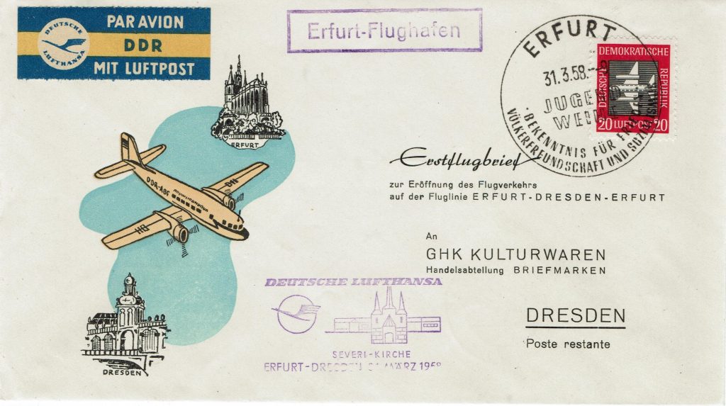 Erstflugbrief der Fluglinie Erfurt-Dresden-Erfurt 31.03.1958 mit der „Deutschen Lufthansa“. Sie war die erste Fluggesellschaft in der DDR und bestand unter diesem Namen von 1955 bis 1963. Sie stand jedoch in keiner Beziehung zur westdeutschen Deutschen Lufthansa AG.
